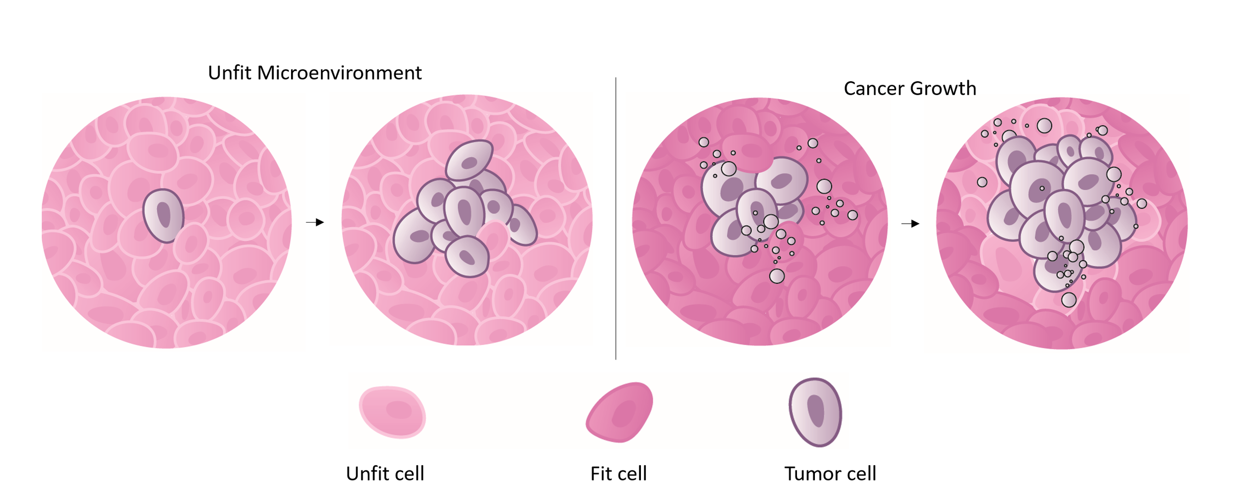 H&E staining of human colon cancer tissue demarcates tumor and host (stromal/tumor microenvironment) cells. “Competitive” and “Fit” cancer cells compete with less competitive cells within the tumor microenvironment (TME) for space. Following competition, cancer cells outcompete and eliminate TME/stromal cells via apoptosis, creating space within which tumor cells can take over, resulting in tumor outgrowth at the expense of normal tissue (Madan et al, Nature, 2020).